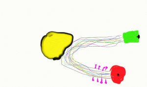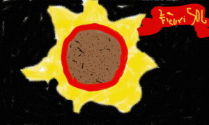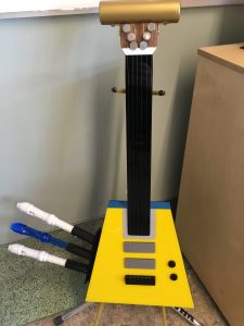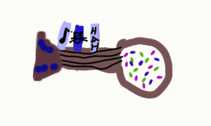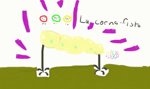 L’instrument que j’ai inventé s’appelle la corne-flûte. Elle a dix trous. On peut faire un son de gazou grâce à des coccinelles: la rouge, la jaune et la verte. La rouge sert à faire un faible bruit de gazou, la jaune un bruit normal de gazou et la verte un gros bruit de gazou. Mon instrument est en forme de coquillage. Lorsqu’on souffle dedans, de la poussière multicolore sort des trous au bout. Il y a des boutons sur les côtés. Lorsqu’on appuie sur un des boutons, un des trous se bouche et permet de faire un son plus grave ou plus aigu.