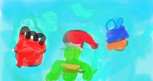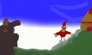 Après, il va voir à l’atelier des lutins. Quand il voit le lutin Éclair, il commence à avoir vraiment vraiment mal au ventre. L’homme à barbe blanche dit: