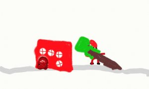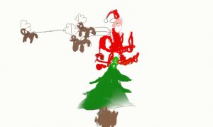 Le Père Noël essaie d’enlever l’arbre mais l’arbre est trop solide. Il demande à ses rennes d’enlever l’arbre, mais le tronc de l’arbre est trop dur.
