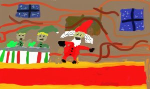 Le Père Noël s’habille chaudement. Il prend la poudre magique et, tout à coup, il n’y a plus de poudre. Les lutins Fripouille et Vadrouille arrivent et le Père Noël dit: