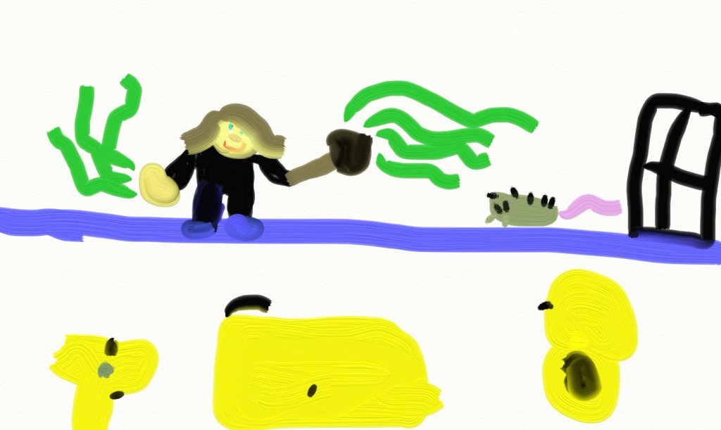 En sortant du fameux bain d’or, Geneviève a une super bonne idée. Elle va essayer de chasser les rats avec le débouche-toilette. Geneviève commence à pourchasser les rats avec son épée imaginaire.