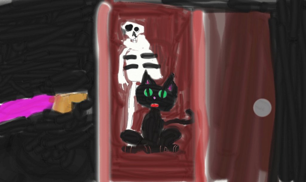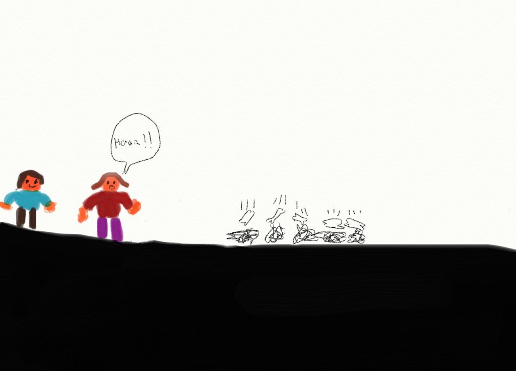 À cause du cri de David, 5 squelettes blanc neige attaquent les enfants! Puisque Annie a encore la voix aigue, elle crie le plus aigu possible tandis que David se bouche les oreilles.