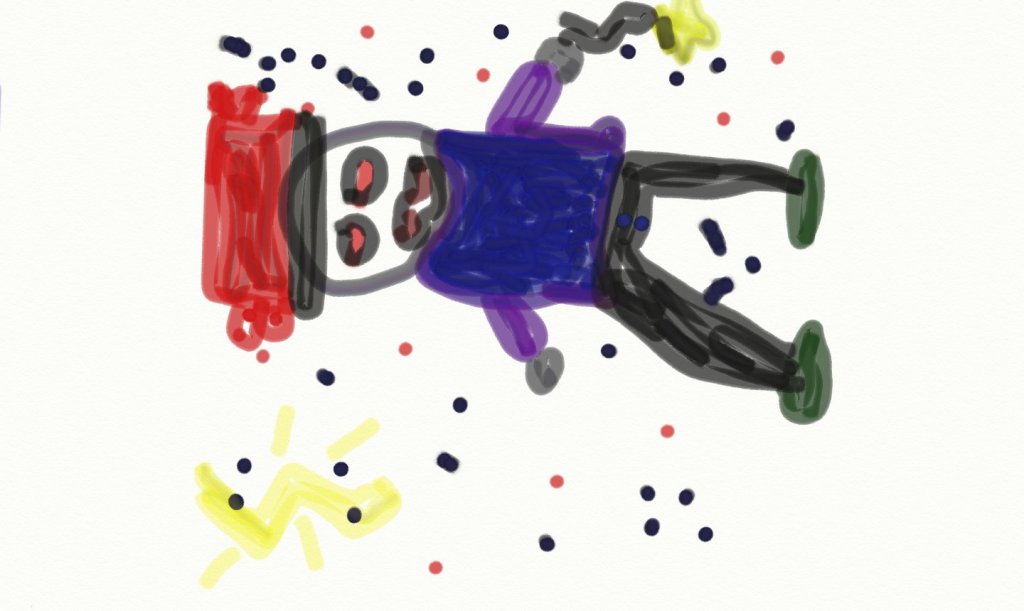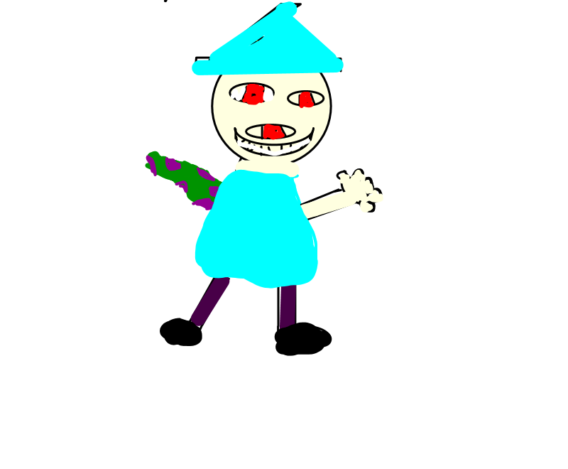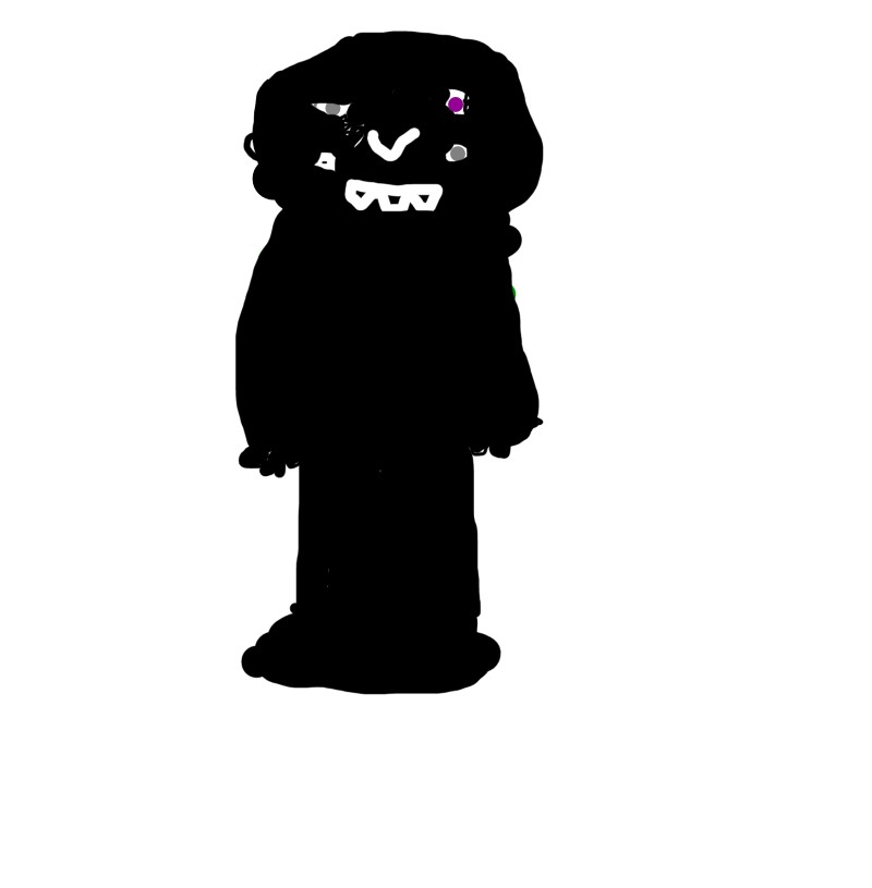 Bobi a des oreilles poilues, une bouche ronde, un ventre de pingouin, des jambes d’ours, des bras musclés et des dents pointues.