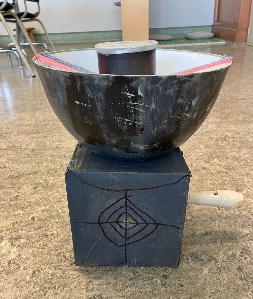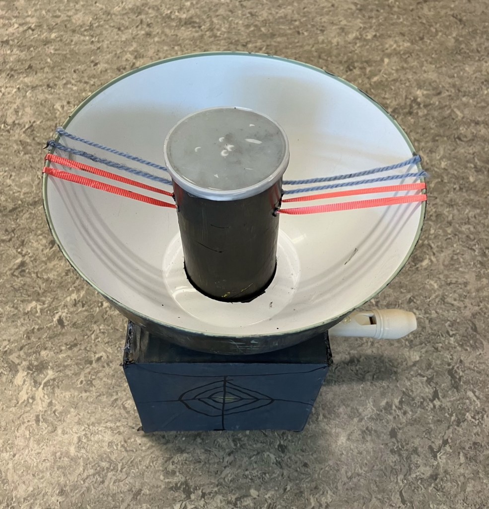 Voici sa description. Sa forme est ronde. Elle mesure environ 100 cm. Elle a des cordes qui sont bleus et les boutons à son sont verts.Elle peut sonner de grave à aigu en quelques secondes. C’est un instrument à cordes et à percussion. Chaque bouton à son sont numérotés de 1 à 38 et les cordes de 1 à 9.
