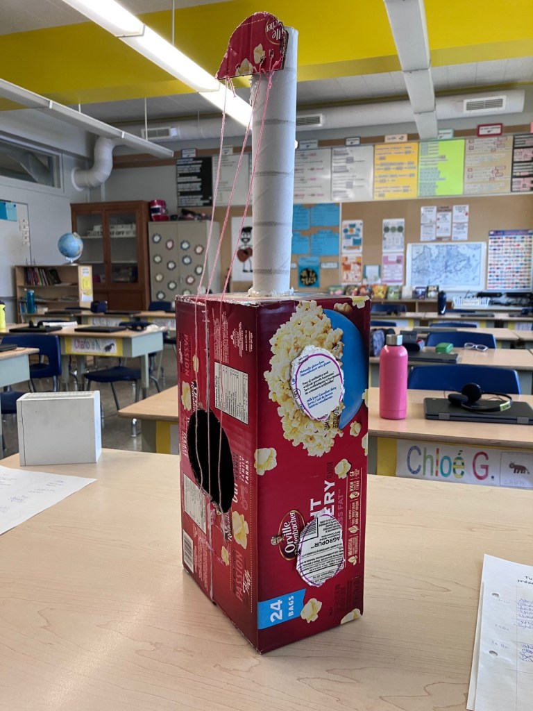 Sa couleur est rouge. C’est une boite de céréale et un ukulélé. Quand il fait un bruit, ça fait tomber des céréales. C’est un instrument à cordes.