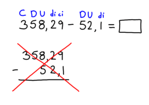 Pour les nombres décimaux, c’est exactement le même principe. Il faut cependant porter une attention particulière à la partie décimale et bien aligner les dixièmes (di), les centièmes (ci) et les millièmes (mi). De plus, puisque la virgule est TOUJOURS située à droite des unités, on se retrouve avec des virgules bien alignées. Il ne faut cependant pas oublier d’ajouter la virgule à notre réponse!
